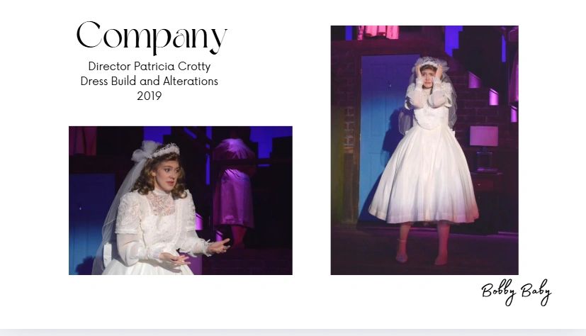Wedding Dress alteration and build. Two vintage dresses from costume stock were altered and attached together with the addition of new lace sleeves, attached petticoat, and various trims.